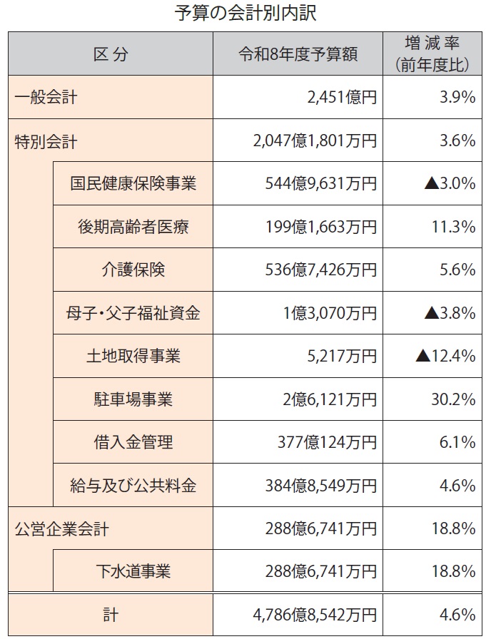 予算総額は、令和7年度に比べて4.6%増の4,787億円、このうち一般会計は2,451億円です。令和7年度2月補正予算で計上している物価高騰対策および安全確保対策事業と一体として、切れ目なく市民の安全と安心を守り、「すべての人が輝き、やすらげる街」づくりを進めていきます。
