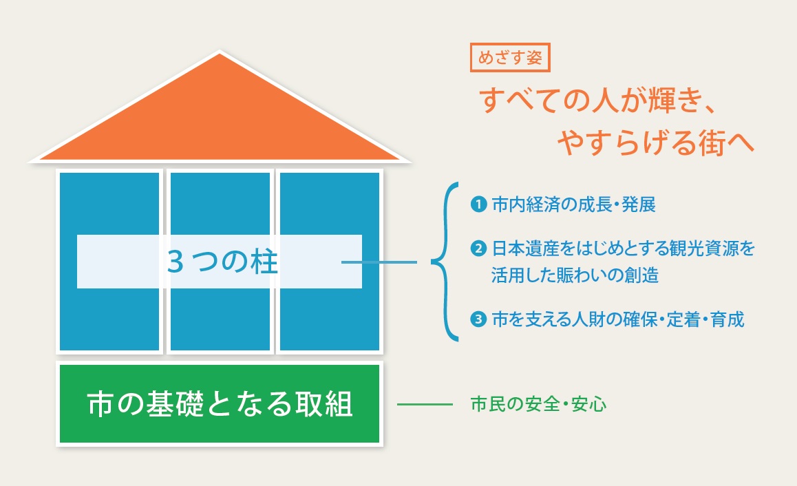 令和8年度当初予算では、本市の未来の設計図である「八王子未来デザイン2040」に掲げる「みんなで目指す2040年の姿」の実現に向けた取組を予算化しています。本市の強みである「市民力」と「地域力」をいかし、「市民の安全・安心につながる取組」を基礎として、「市内経済の成長・発展」、「日本遺産をはじめとする観光資源を活用したにぎわいの創造」、「本市を支える人財の確保・定着・育成」の3つの柱を中心とした取組を推進します。