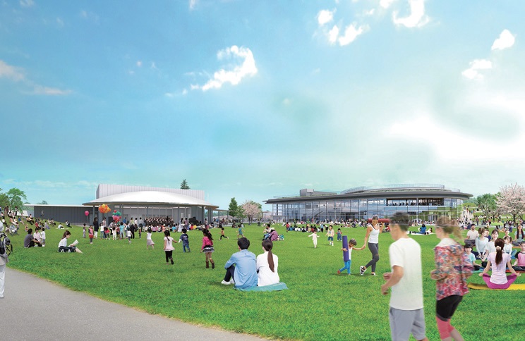 八王子駅南口の医療刑務所跡地に建設される、公園・ライブラリ・ミュージアム・交流スペースが一体となった複合機能施設「桑都の杜」。学び・交流・防災の3つの機能を備えています。