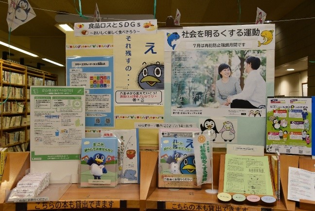 (「社会を明るくする運動」広報活動時集合写真) (市内図書館でのテーマ展示の様子)