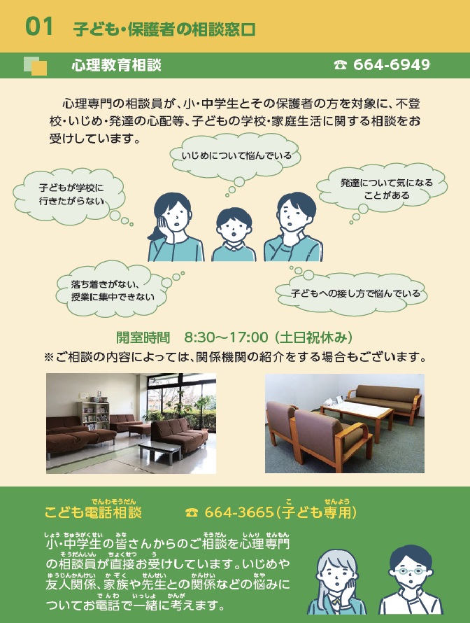 教育センターにある「心理教育相談」や「就学相談」などの相談窓口のほか、様々な支援・相談に関する情報をご紹介しています。