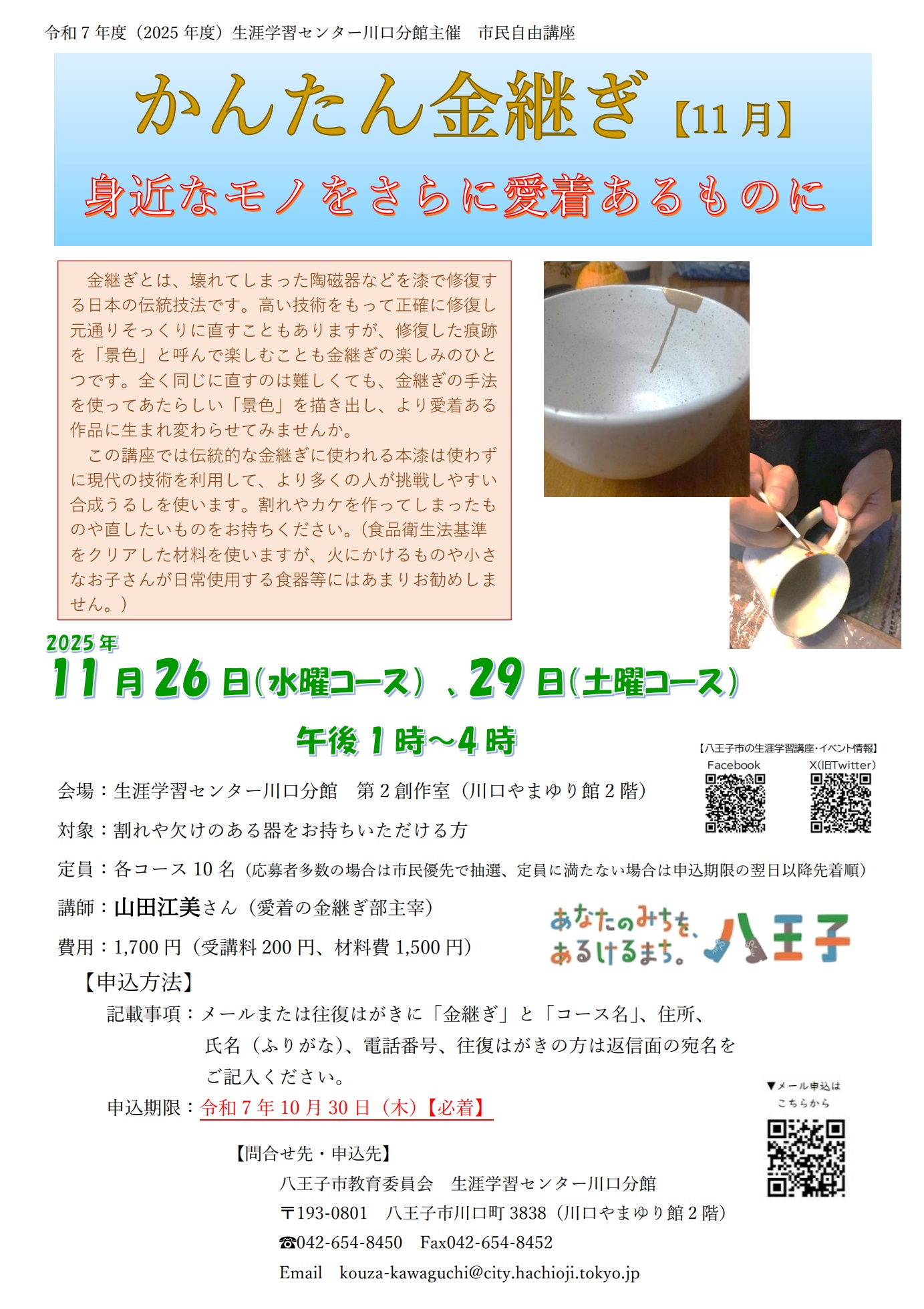 - トップ > イベント情報 > 講座・教室 > 市民自由講座「かんたん金継ぎ~身近なモノをさらに愛着あるものに【11月】(水曜コース/土曜コース)」