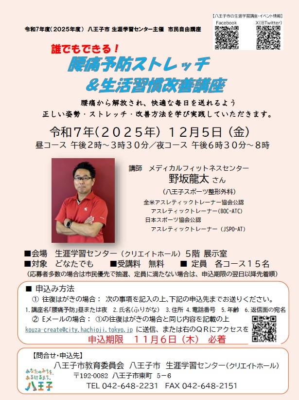 市民自由講座「誰でもできる!腰痛予防ストレッチ&生活習慣改善講座」昼コース/夜コース