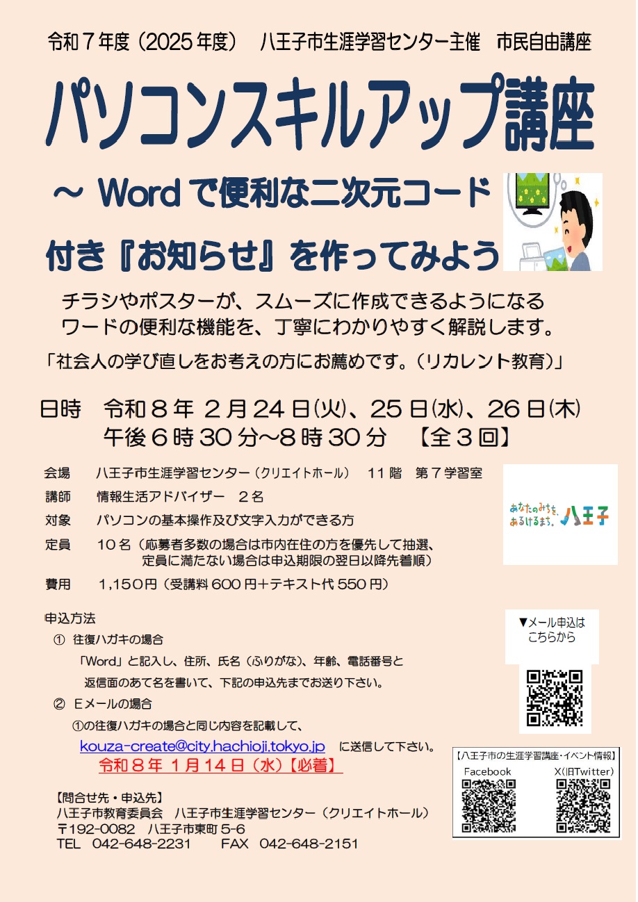 - トップ > イベント情報 > 講座・教室 > 市民自由講座「パソコンスキルアップ講座 ~Wordで便利な二次元コード付き『お知らせ』を作ってみよう」