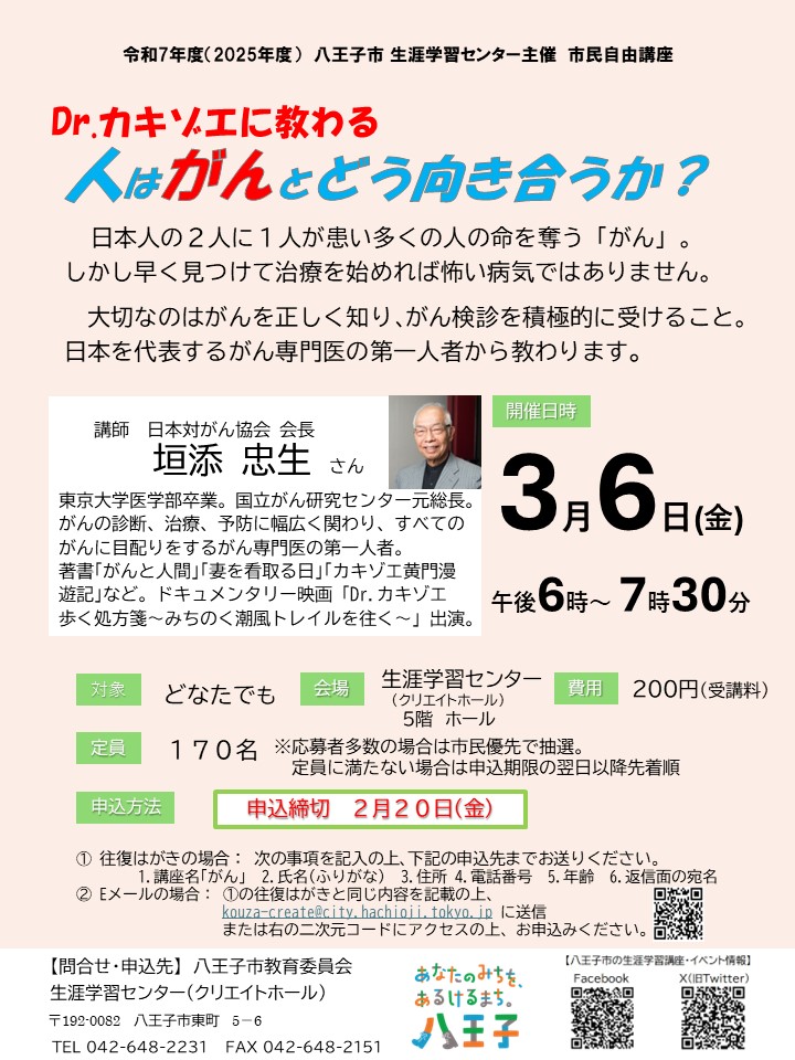 - トップ > イベント情報 > 講座・教室 > 市民自由講座「Dr.カキゾエに教わる 人はがんとどう向き合うか?」
