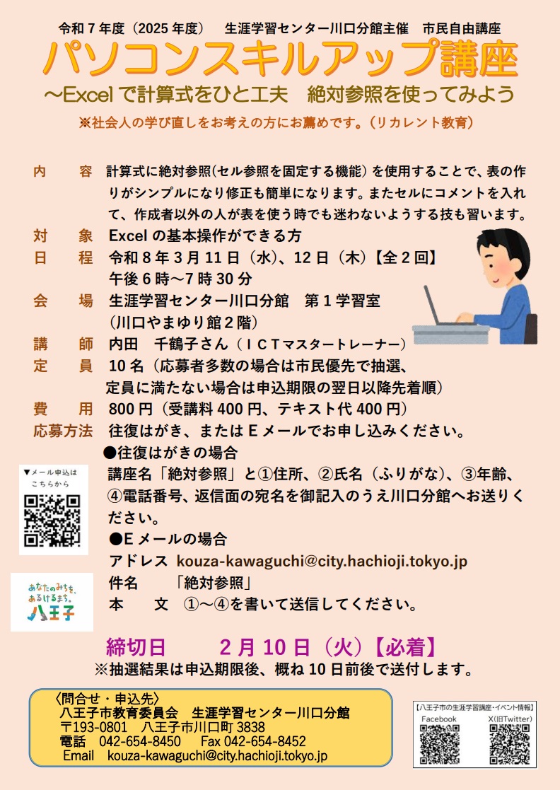 - トップ > イベント情報 > 講座・教室 > 市民自由講座「パソコンスキルアップ講座 ~Excelで計算式をひと工夫 絶対参照を使ってみよう」