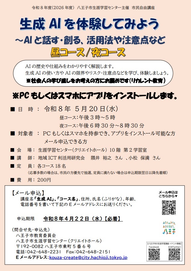 市民自由講座「生成AIを体験してみよう~AIと話す・創る、活用法や注意点など 昼コース/夜コース」