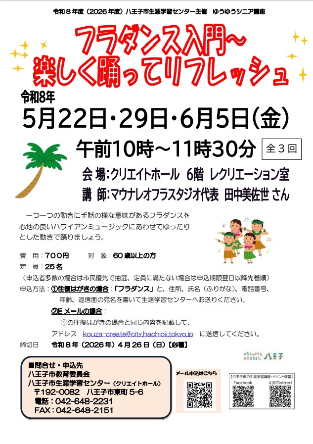 - トップ > イベント情報 > 講座・教室 > ゆうゆうシニア講座「フラダンス入門~楽しく踊ってリフレッシュ」