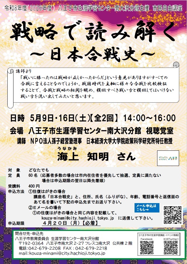 - トップ > イベント情報 > 講座・教室 > 市民自由講座「戦略で読み解く~日本合戦史~」