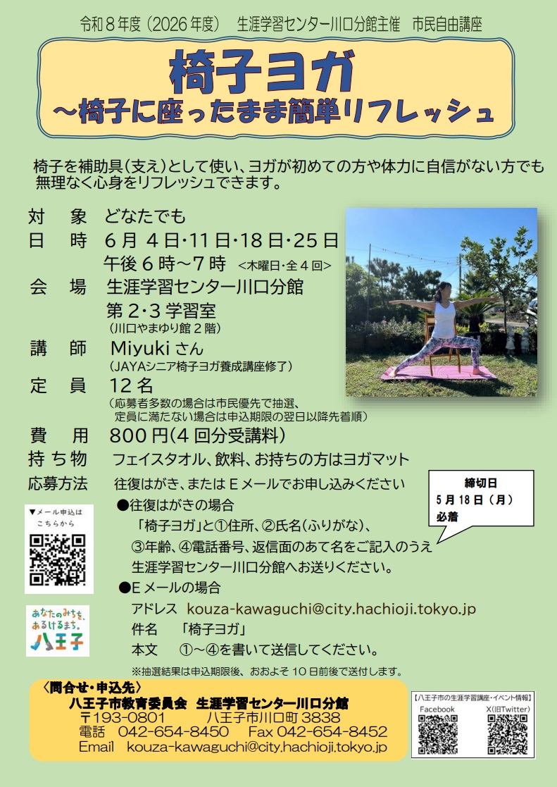 - トップ > イベント情報 > 講座・教室 > 市民自由講座「椅子ヨガ~椅子に座ったまま簡単リフレッシュ」