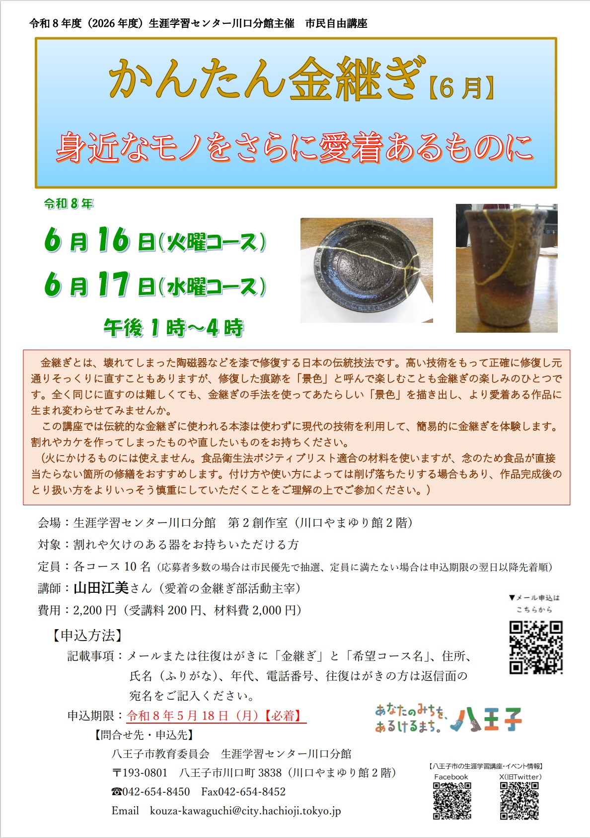 市民自由講座「かんたん金継ぎ~身近なモノをさらに愛着あるものに【6月】」のリーフレット(画像形式(JPG) 598キロバイト)