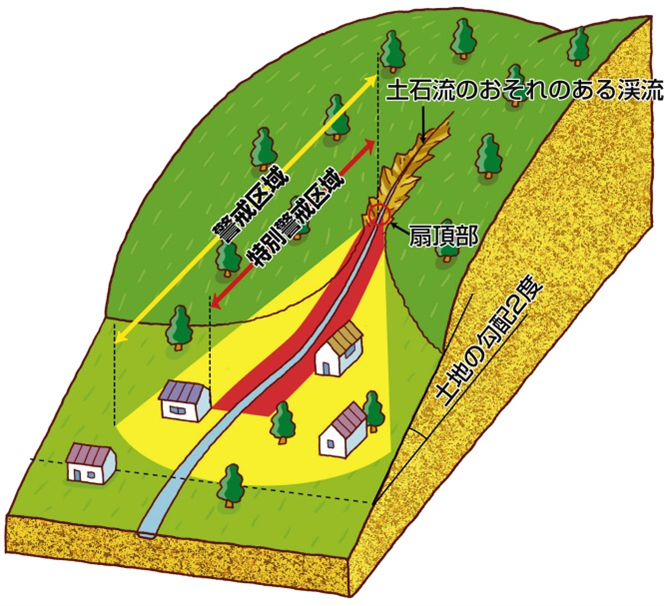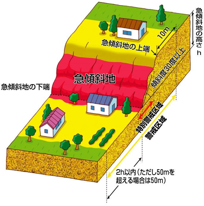 土砂災害特別警戒区域(レッドゾーン)とは、土砂災害警戒区域(イエローゾーン)内において、建築物に破損が生じ、住民等の生命に著しい危険が生ずる恐れがあると認められる区域(下図の赤色の部分)をいいます。
