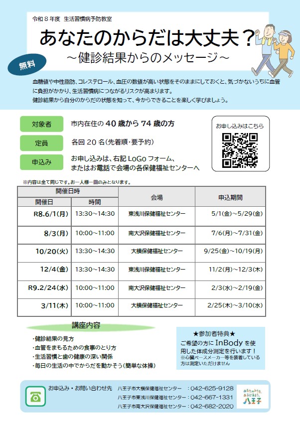 保健福祉センターでは、市内在住の40歳から74歳の健康が気になり始めた方を対象に生活習慣病予防教室を開催いたします。