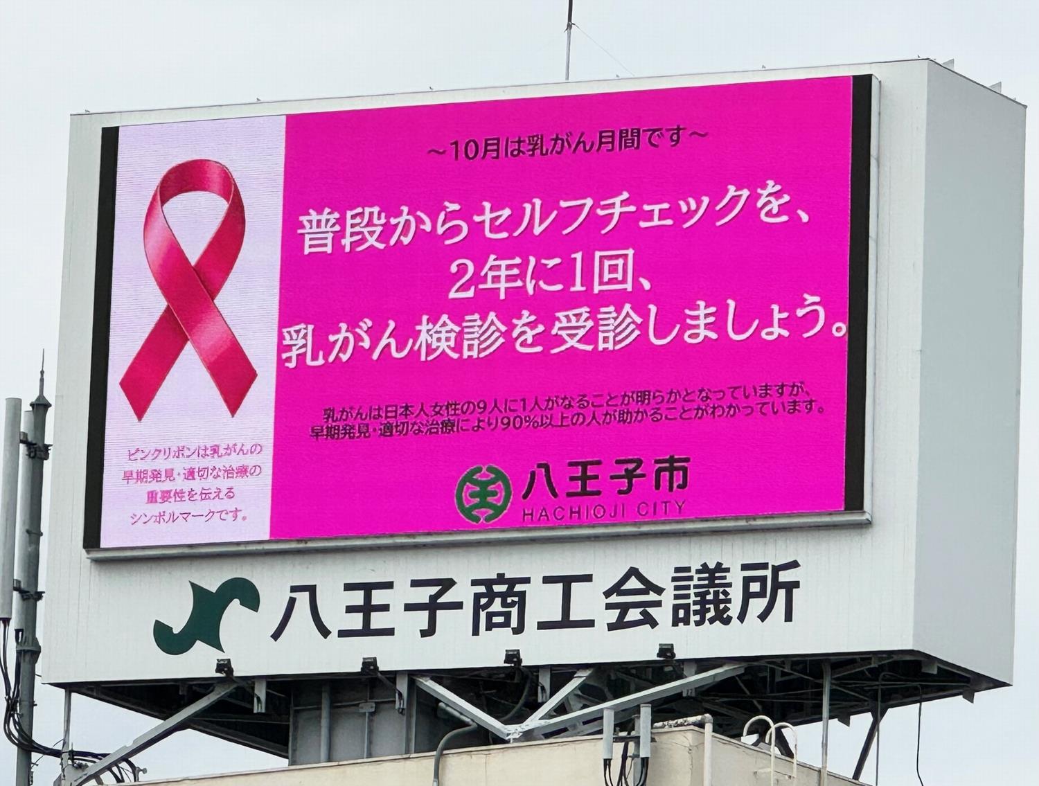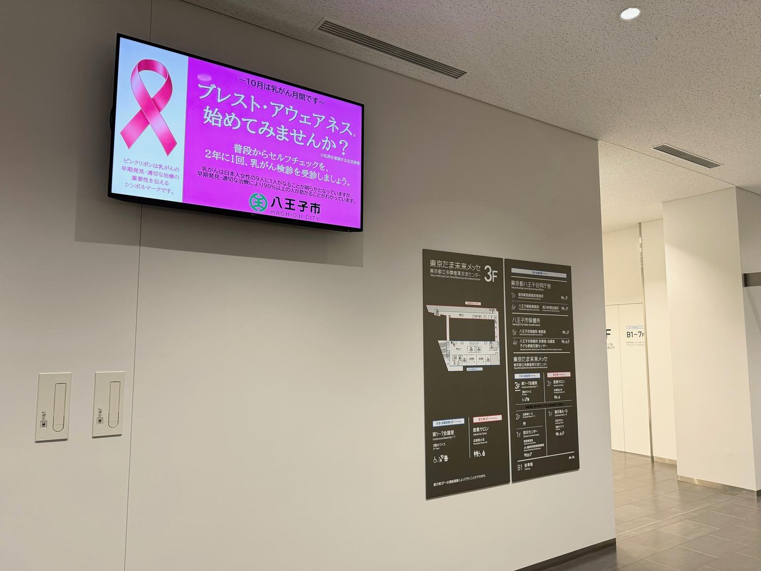 東京たま未来メッセ及び八王子商工会議所におけるデジタルサイネージでの乳がん月間の放映