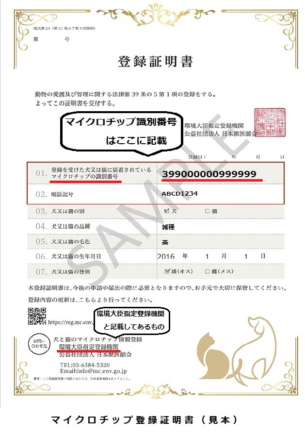 ・マイクロチップ識別番号がわかるもの:環境大臣指定登録機関から交付された マイクロチップ登録証明書