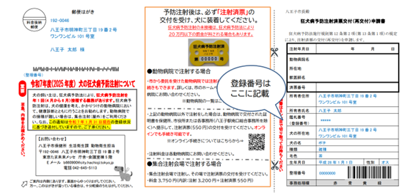 ・鑑札番号がわかるもの:八王子市から交付された犬鑑札またはお知らせハガキ「犬の狂犬病予防注射について」