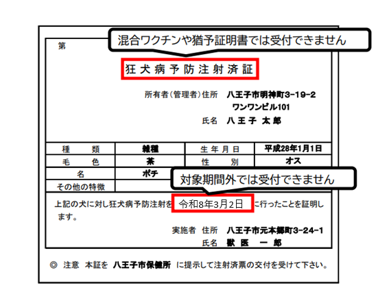 ※「混合ワクチン接種証明書」や「注射猶予証明書」等の異なる用紙や、注射日が対象期間外の場合はお手続きできません。(対象期間:令和8年3月2日から令和9年3月1日まで)