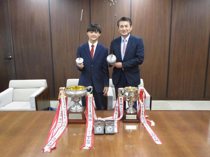 令和7年(2025年)7月19日から21日に駒沢オリンピック公園室内競技場で開催された「第11回全国中学生フェンシング選手権大会」において、「フルーレ」「エペ」で2種目優勝(男子初)を果たした市立陵南中学校2年生の島村大翔さんが市長を訪問しました。大翔さんは、「昨年悔しい思いをしたので、男子初の2種目で優勝できてよかった」と報告しました。市長は、「中学2年生での2種目優勝はとてもすごいこと、今後のさらなる活躍を期待しています」と激励しました。