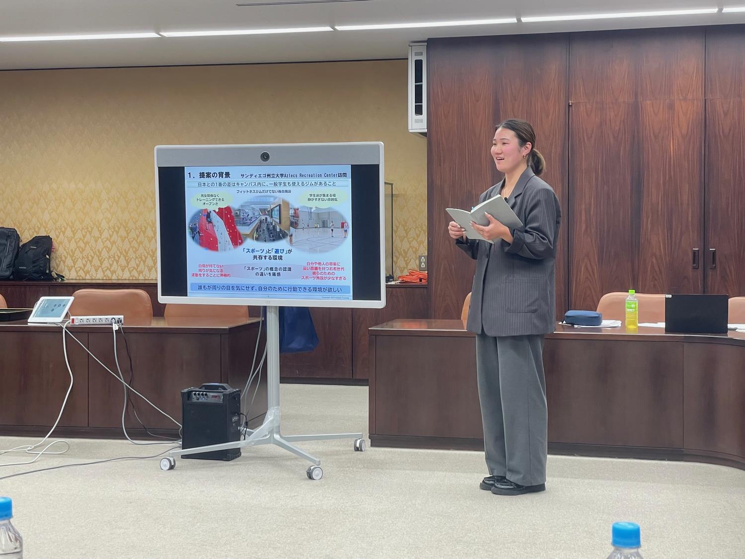 友田さんは、自身のアメリカでの経験をもとに、コミュニティジムとカフェを併設させ、スポーツをすることへの心理的ハードルを下げるとともに、自分がやりたいことを周りを気にせずにできる空間を学内に創出するプランを提案しました。市長は提案に耳を傾け、熱心に質問していました。