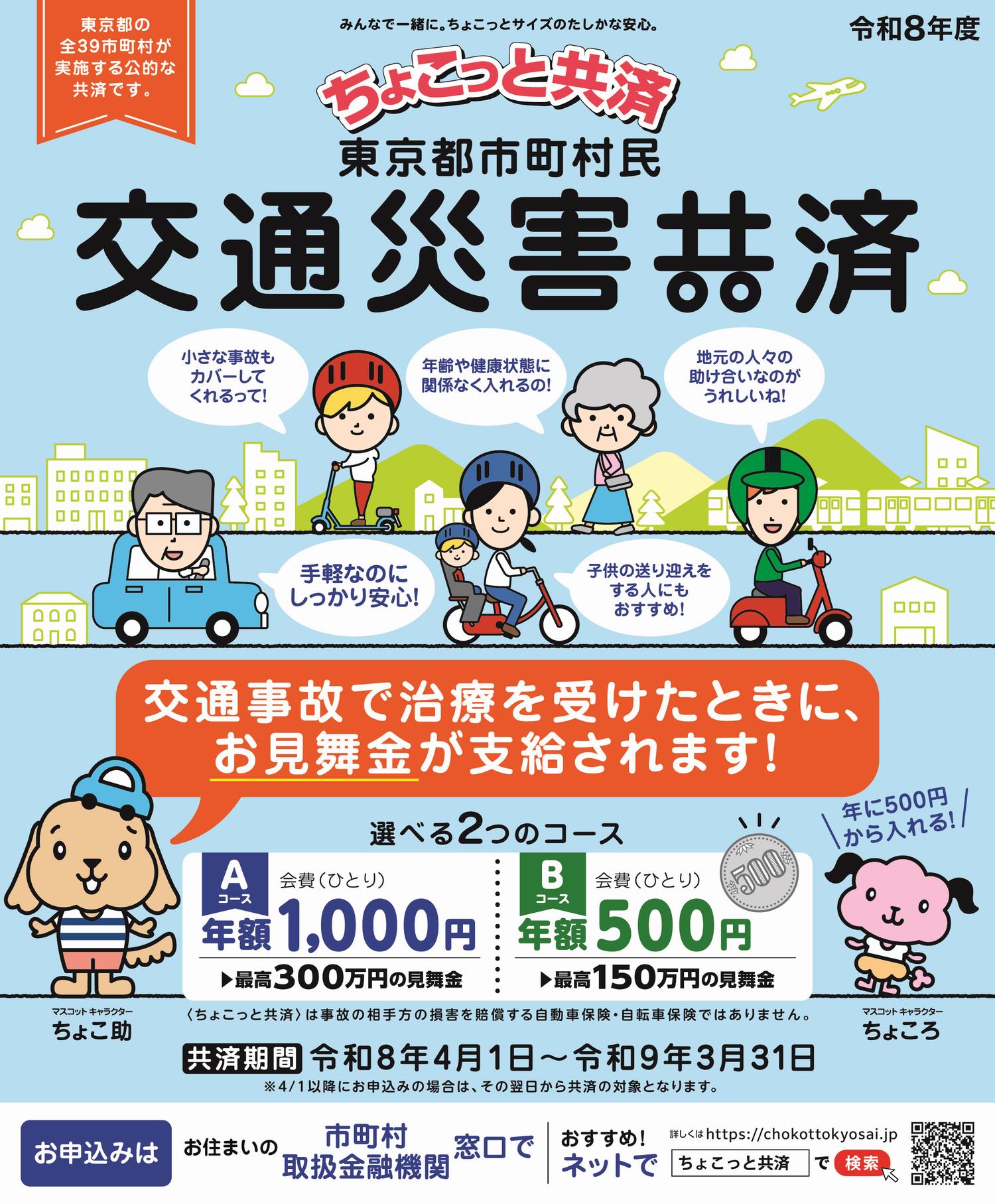 ちょこっと共済(東京都市町村民交通災害共済)は、交通事故でけがをしたり、万一亡くなったときに、割安な掛け金で災害の程度に応じて最高300万円の見舞金が受けられる制度です。