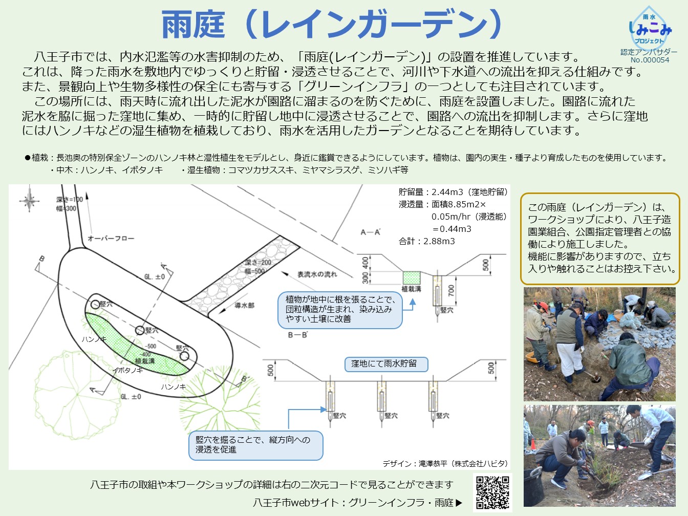 (幅4.5m、深さ50センチメートル)を採用しました。さらに底面にたて穴を掘ること、長池公園に自生している植物を植えることで将来的な土壌改良(浸透機能の向上等)を期待し、雨庭の多面的な機能もデザインされています。