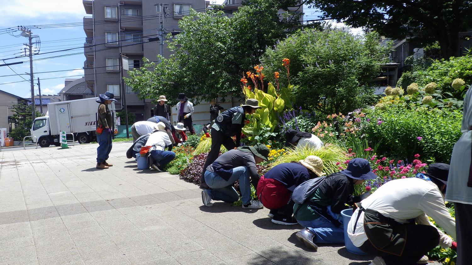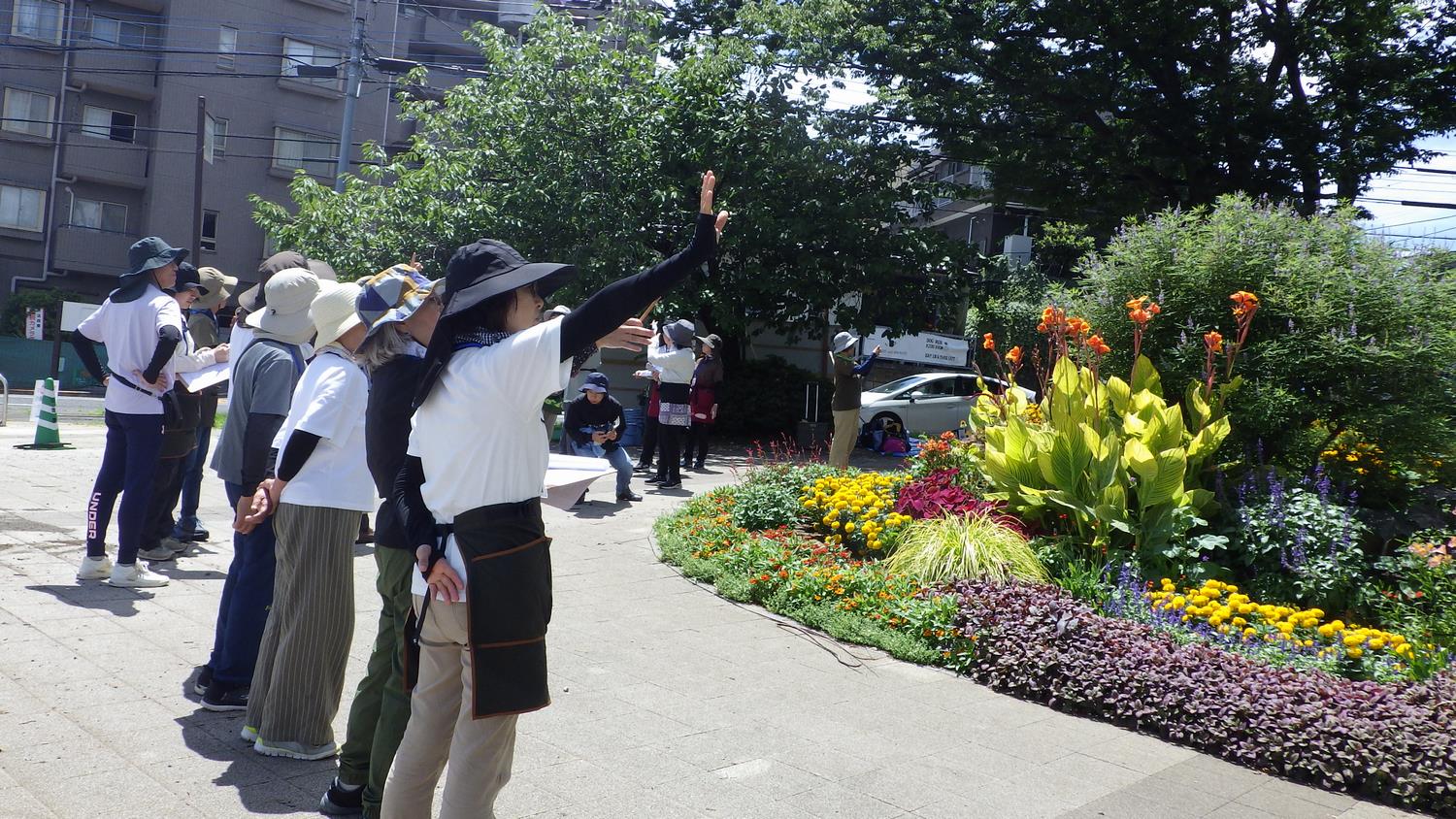花壇のメンテナンス作業を行いました。講師より花の種類ごとの注意点を説明いただいた後、距離を取りながら全員で花がら摘みを行いました。 |