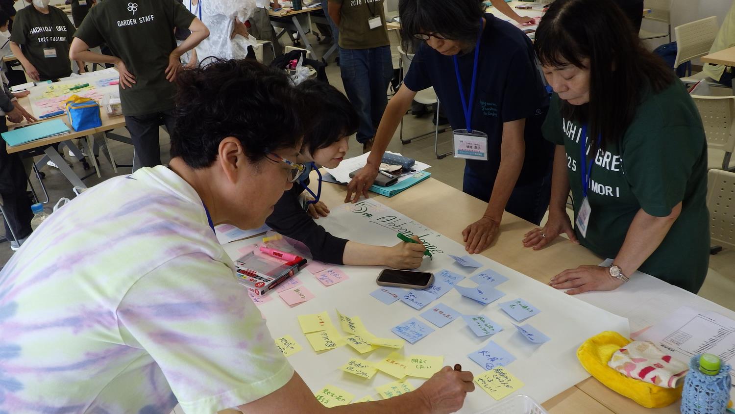 模造紙にまとめ、発表しました。 講師からの講評の後、多数決にて「ハッピーガーデンから広がる花のきずな」をデザインテーマに選びました。 |