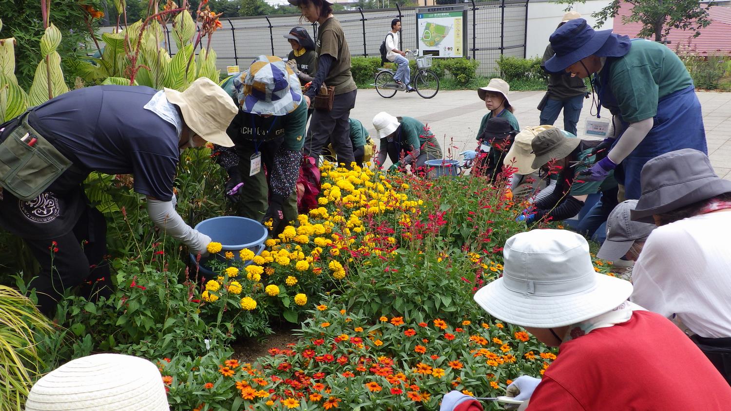 富士森公園内のHAPPY GARDENのメンテナンス実習として、花がら摘みを行いました。 |