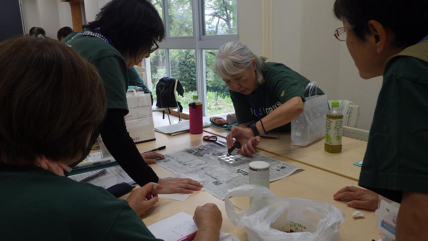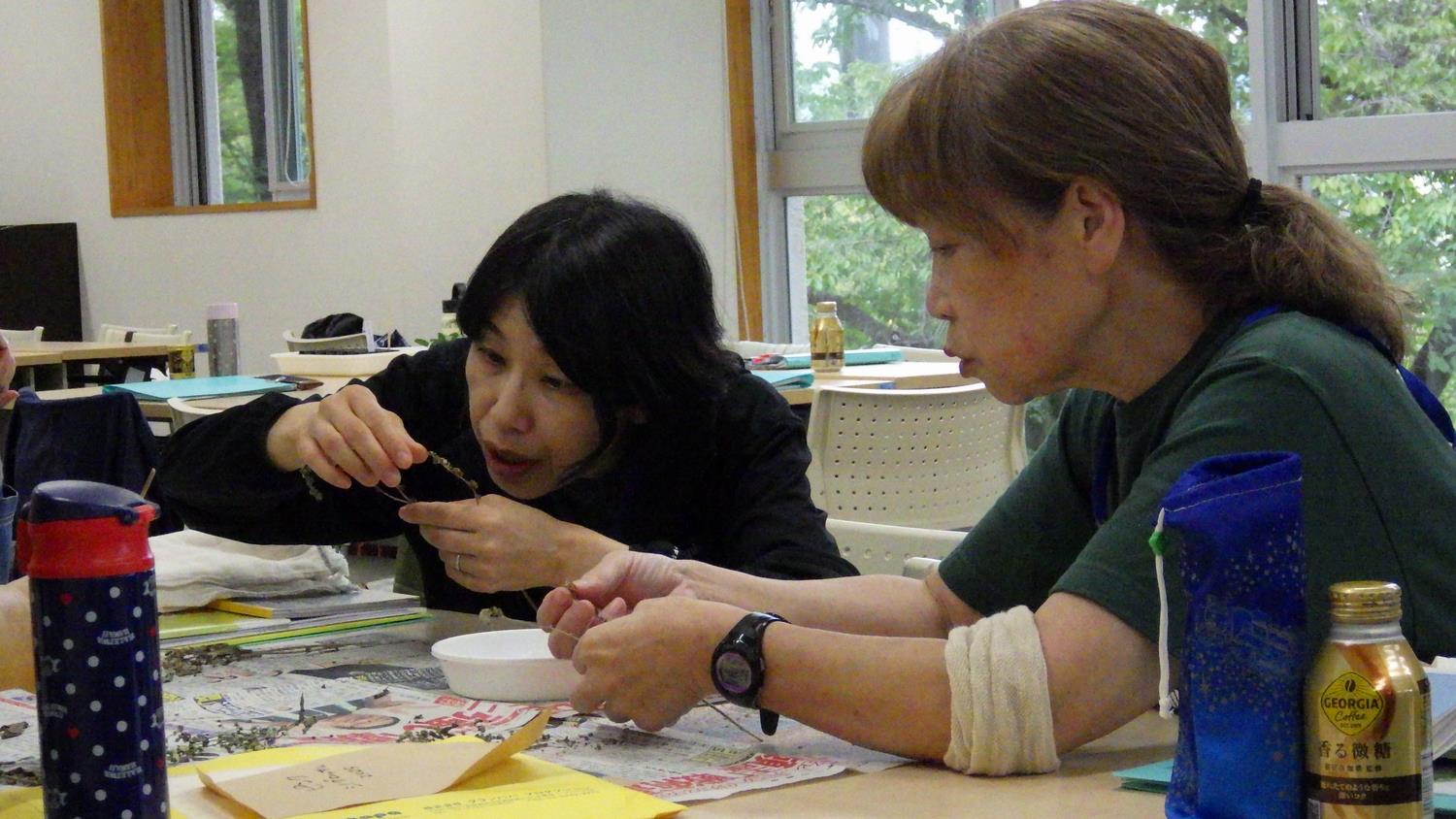 屋内に戻って講義の後、収穫した種子の仕分け作業を行いました。 |
