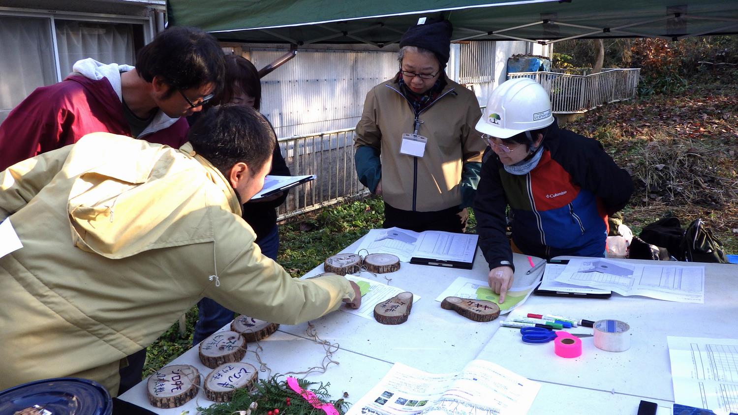 「緑地の管理計画の必要性と立て方」では、第2回で使用した長池公園内の緑地を舞台に、2班に分かれて緑地の調査から年間の管理計画を立てるワークショップを行いました。 難しい内容でしたが班ごとに、手書きの地図やイラストを交えた管理計画を作成しました。 |