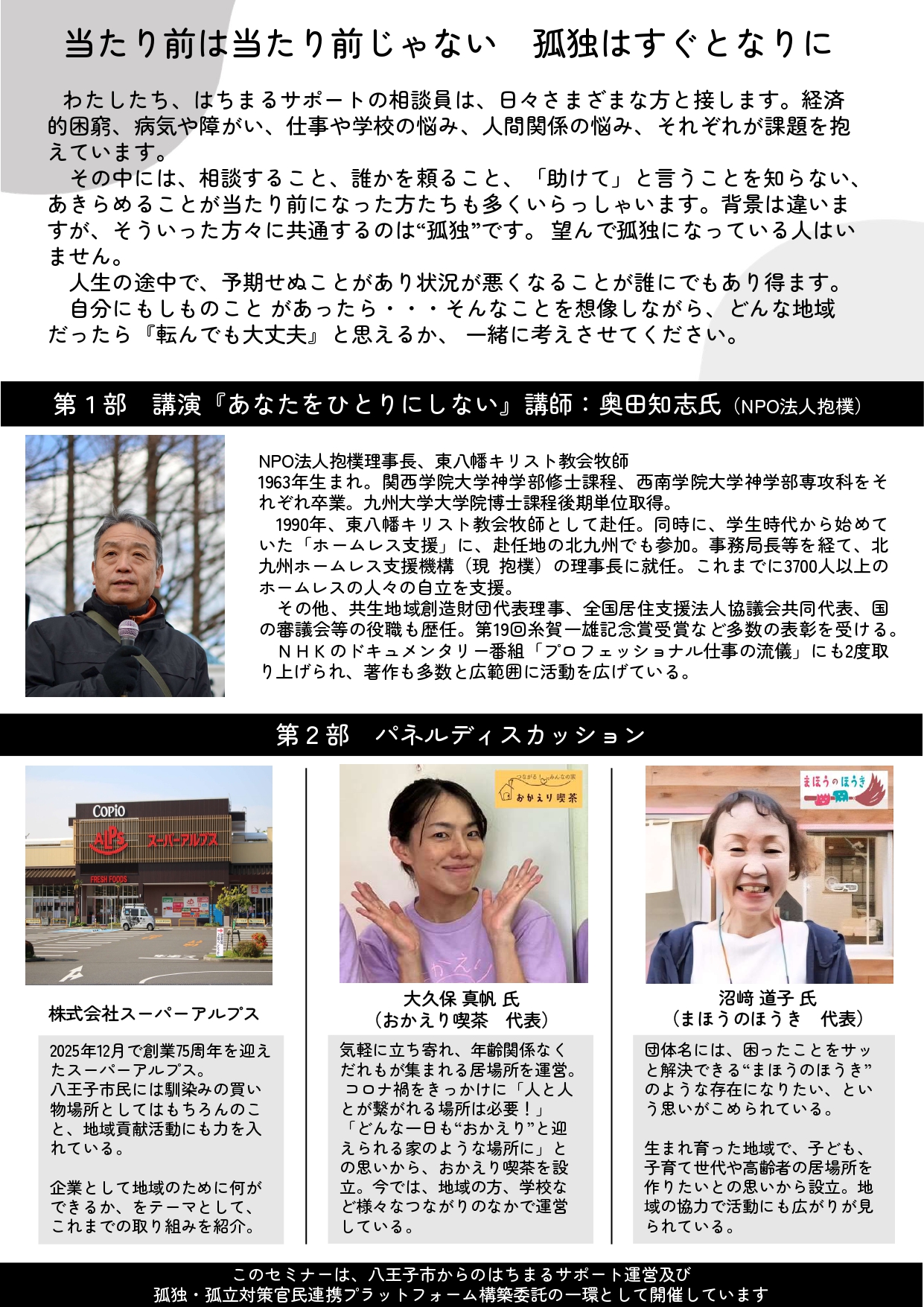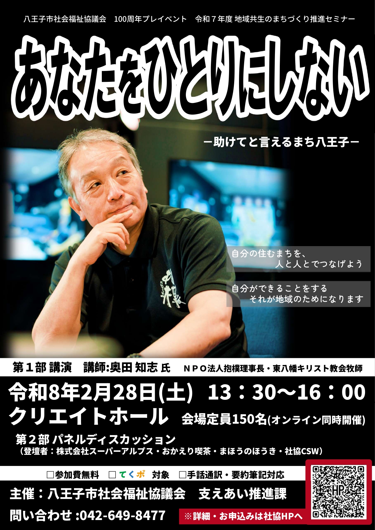 今年度は、「あなたをひとりにしない-助けてと言えるまち八王子-」をテーマとして、ホームレス支援などに取り組むNPO法人抱撲の理事長・奥田知志氏をお招きしての講演や、支援団体等によるパネルディスカッションなどを通じて、自分にもしものことがあったら、どんな地域だったら『転んでも大丈夫』と思えるかを考えます。