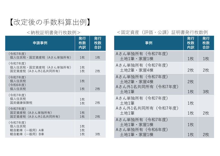 - トップ > くらしの情報 > 税金 > 税に関する証明書について > 証明書に関するお知らせ > 2026年(令和8年)1月1日から一部証明書の手数料の計算方法を改定します
